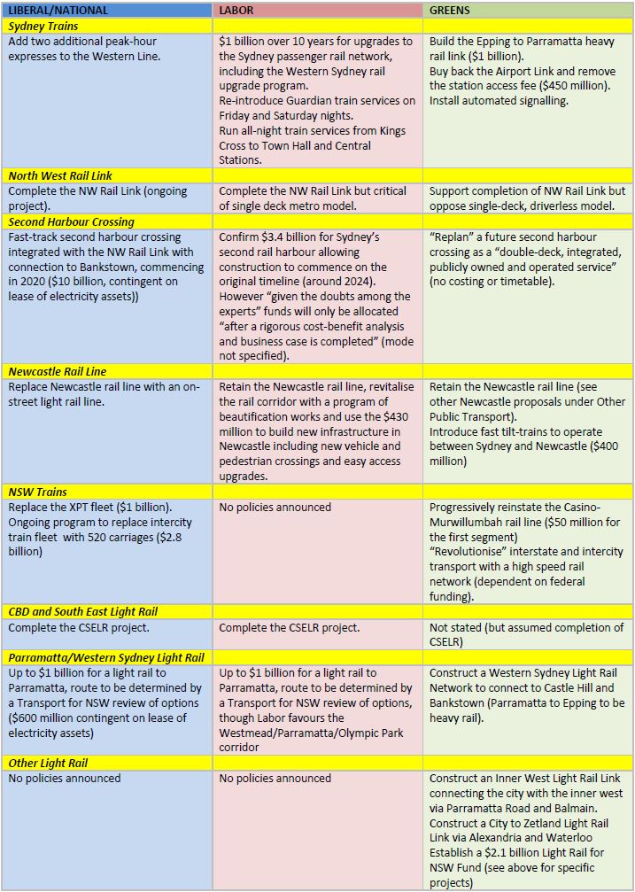 I thought it would be useful to summarise what the major parties – The Liberals/Nationals, Labor and the Greens – are promising in relation to transport in relation to the upcoming NSW state election. The following is drawn from a range of policy statements, media releases and websites and as a result is likely to be incomplete – it would seem that with the partial exception of the Greens, the days of parties releasing detailed election statements containing all their policies and election commitments in one package are over. Nonetheless this table should provide a useful starting point, though it should be noted that no responsibility is taken for the completeness or accuracy of this information.