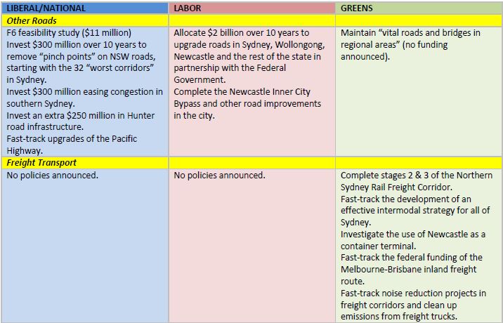 - All the party platforms have tended to concentrate on big-ticket infrastructure items. With the partial exception of the Greens’ transport paper there is little discussion regarding bus services for example, or issues such as community transport or transport for disadvantaged people. Some major underlying infrastructure issues have also been ignored, for example the need to upgrade the poor state of railway tracks in many parts of regional NSW which would almost certainly be required to complement the LNP proposals for new country and intercity trains. The Greens are also the only party which has addressed freight transport issues in any detail.