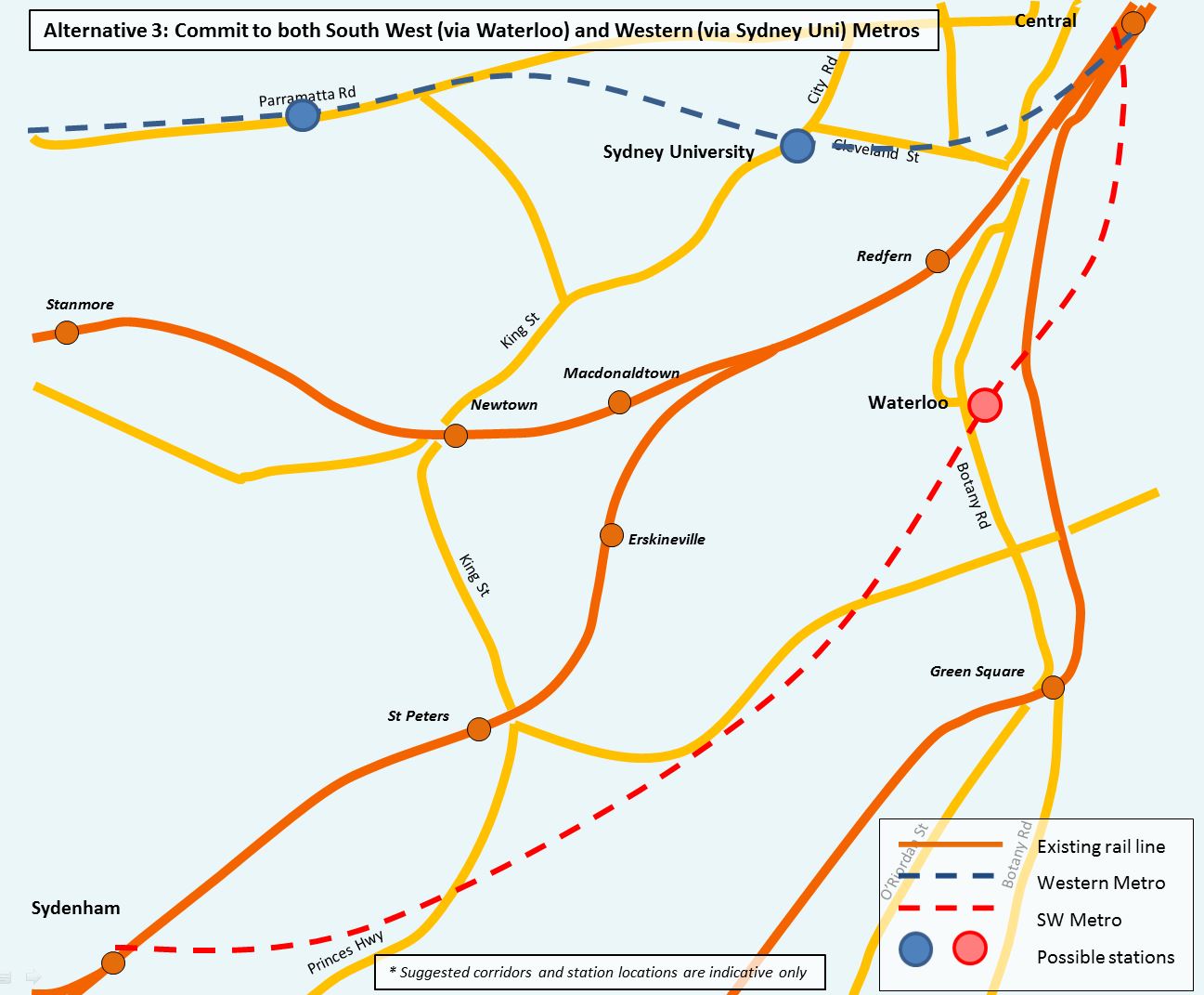 3. Commit to building the Western Metro. The metro line would divide after Central with the Southwest Metro going to Sydenham with a station at Waterloo and the Western Metro line going via Sydney University.