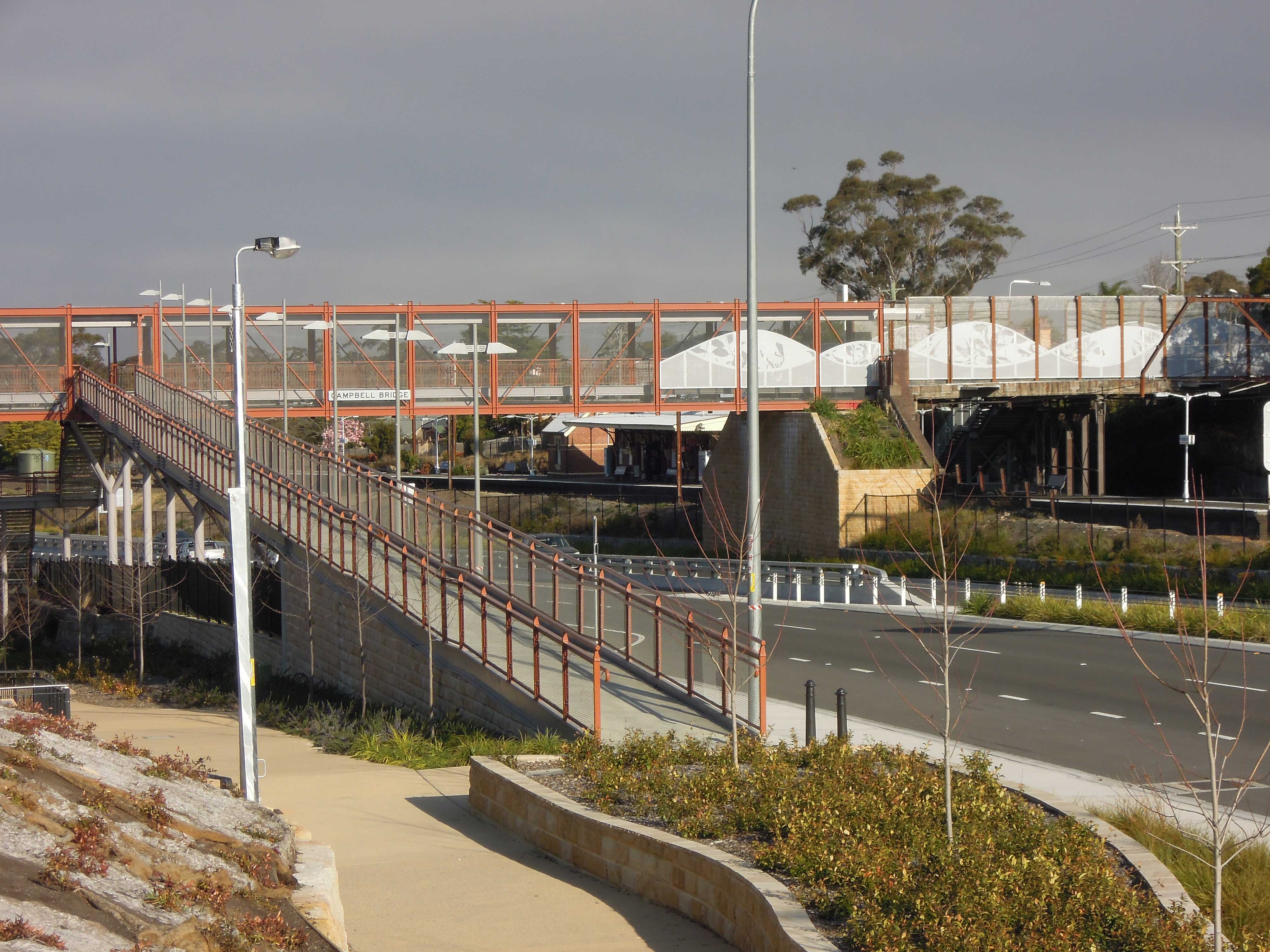 Linking them that is, for people without disabilities – and who are also unencumbered with prams, strollers or shopping trolleys. Most of the old pedestrian bridges over the railway were built without any form of wheelchair or other disabled access. The new road crossings have been built to modern disability access standards, usually with ramps, but in most cases these have not been retrofitted to the existing pedestrian rail crossings they link to. This has led to the strange structures I described above, bridges with expensive and extensive ramps on one side of the highway but with steep staircases on the other side of the railway, or with ramps at either end but no disabled access to the railway station platforms underneath them.