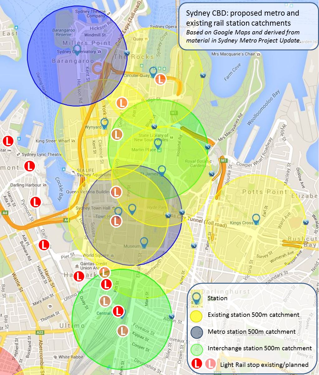 Given that there are already seven stations within the relatively small confines of the CBD there is significant overlapping of the current catchments and it is hardly surprising that the impact of the metro will be largely in terms of improving capacity rather than extending coverage. In addition two of the stations (Martin Place and Central) are interchanges and a third (Pitt Street) is only 150 m from Town Hall station and only slightly further away from Museum and St James stations.