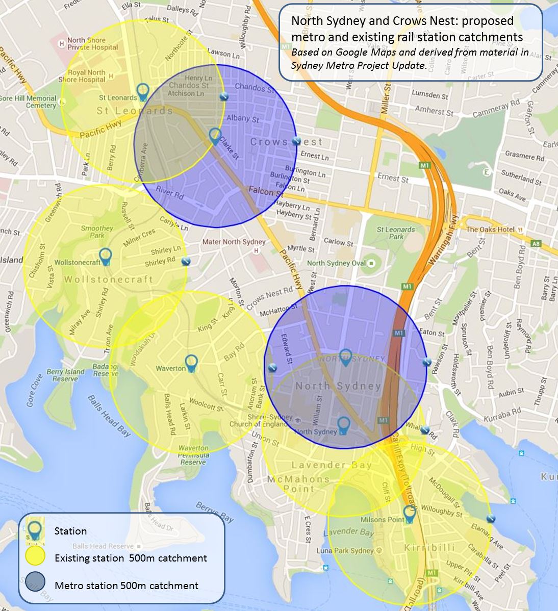 Between these two sections will be the heart of stage two of the metro project – the 15km section that will run entirely underground from Chatswood to Sydenham via the CBD. As this will be close to existing rail lines there is inevitably going to be some overlap in the walk-up station catchments between the new and existing systems, including of course those stations which will act as interchanges where the catchments will be identical.