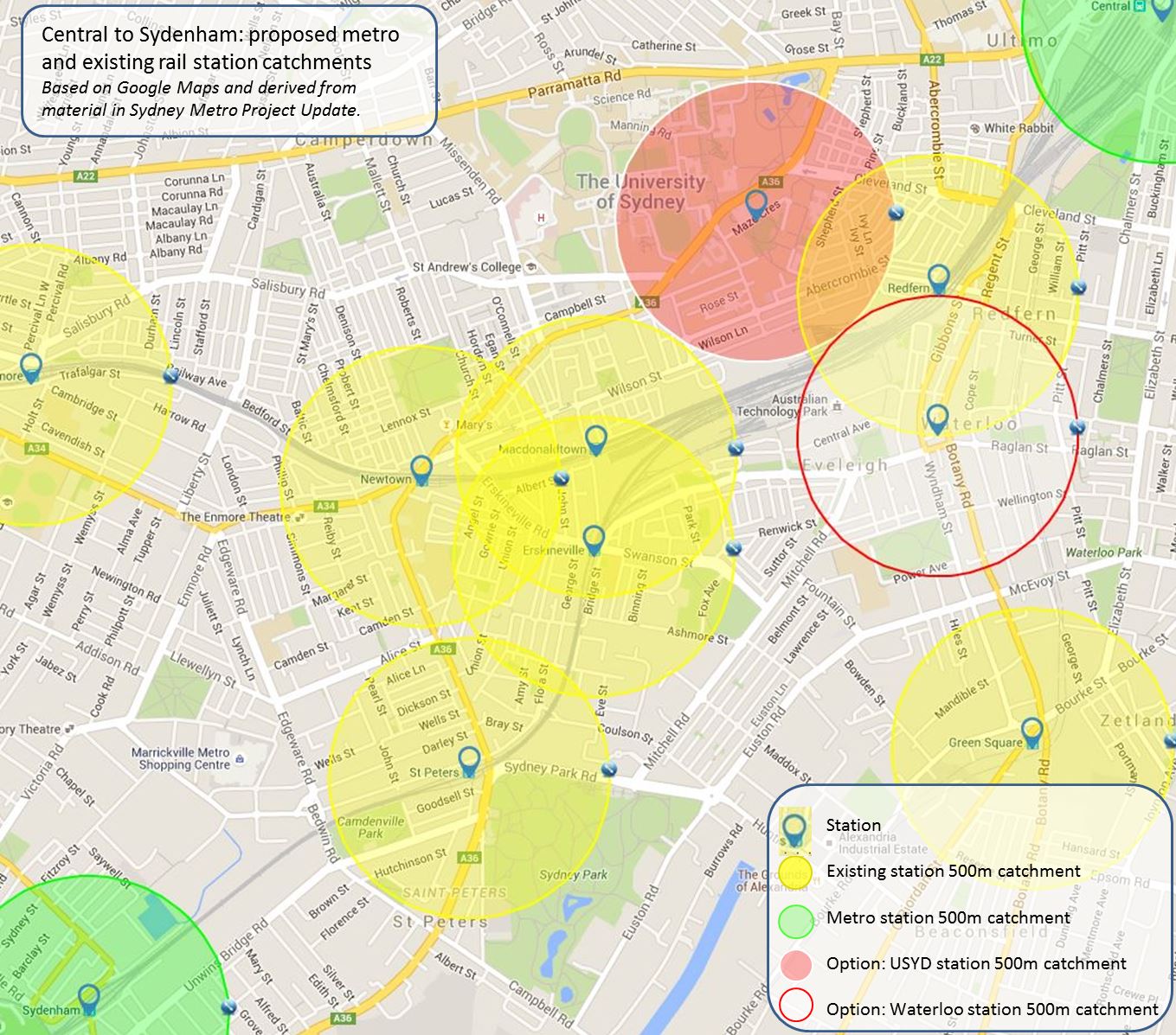 I’ve also attempted to show the catchments for the two station options still under consideration. The university has nominated a specific site at Maze Crescent, but while a site in the vicinity of the Botany Road Raglan Street intersection has been mentioned a specific site for Waterloo was not proposed in the metro Project Update. The catchments for both proposed locations overlap that of the existing Redfern Station; the university site is further away and would service over half the university within 500 metres and most of the remainder of the campus and Prince Alfred Hospital within 800 metres, as well as a range of other institutions. Meanwhile the Waterloo site would provide access to the Australian Technology Park but would play a more significant role in supporting residential development in this area.