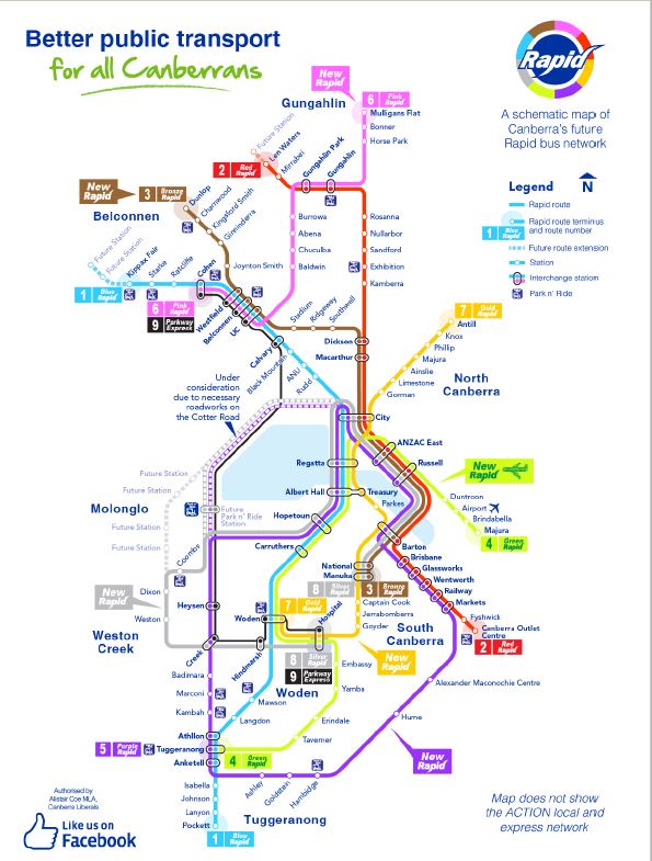 The opposition has vowed to scrap the light rail project even though a successful tenderer has been announced and construction is likely to commence before the next ACT election (see TSW7). As an alternative the opposition’s Canberra Rapid Bus Network would add six new rapid bus services to the city’s current Red (Gungahlin to Fyshwick) and Blue (Tuggeranong to Belconnen) Rapid bus routes.