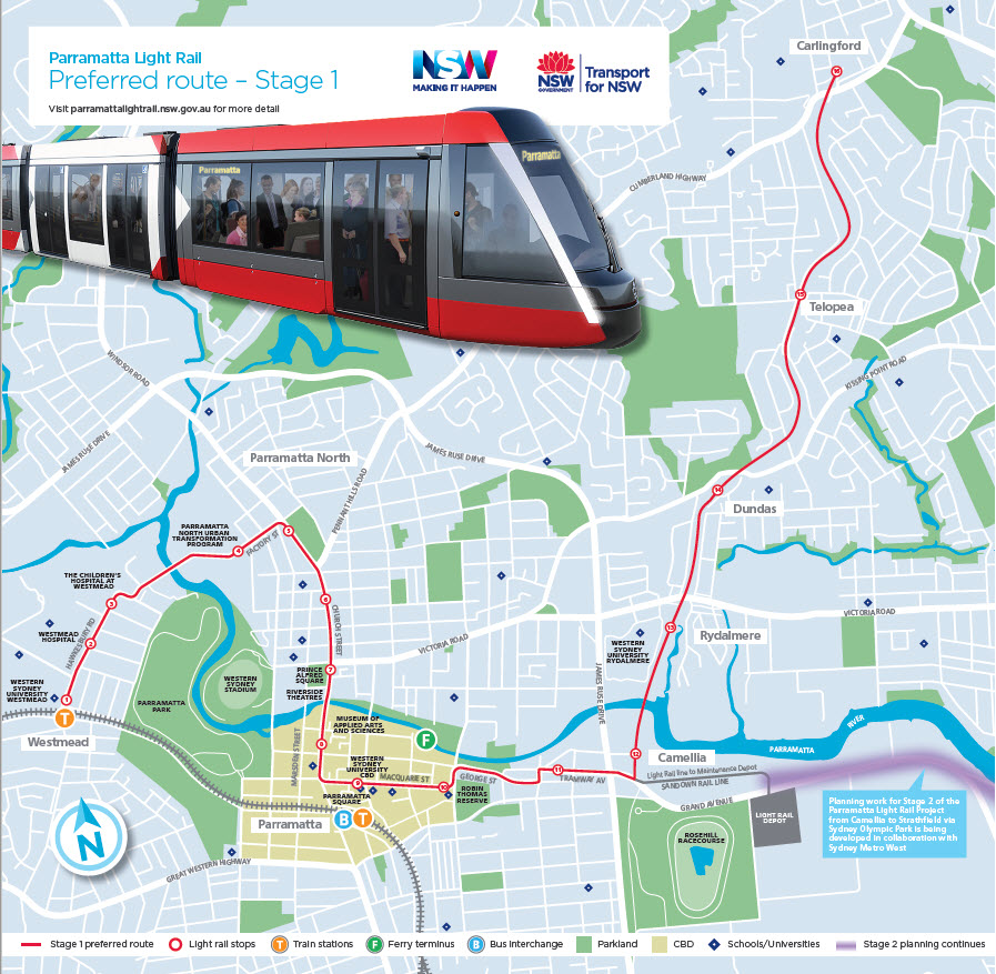 While it is disappointing that the government announcement has confirmed the retreat from Parramatta Council’s original vision of a connection from the light rail line to Eastwood and Macquarie Park, the line selected still follows much of Parramatta Council’s preferred route. The route, especially the section between Westmead and Camellia is a better option to start with if as the government has indicated the project has to be broken into stages.
