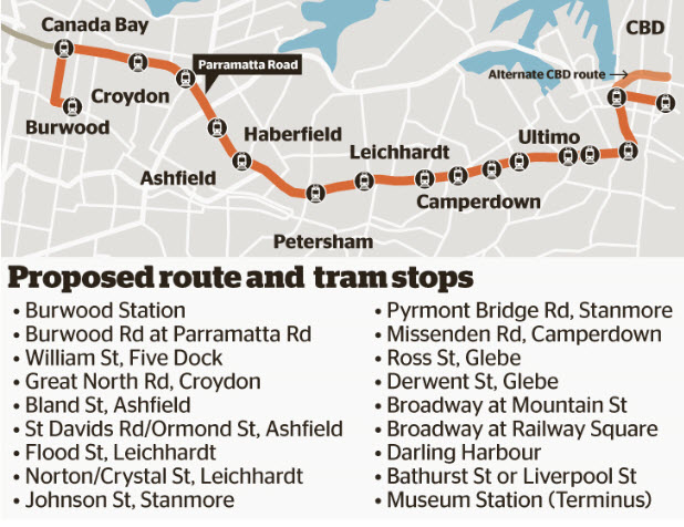 The provision of a light rail line, a concept which has been discussed for decades, was the government’s initial response. Under the PRIT proposal this would have taken the form of a 13km line with 18 stops starting next to Burwood Station. From there it would have run northwards along Burwood Road, turning east into Parramatta Road before heading into the city via a potential interchange with the existing Inner West light rail line at Taverners Hill.