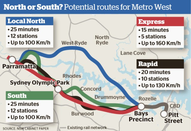 The Cabinet leak – or at least its interpretation by the Sydney Morning Herald – suggests that while I was wrong to dismiss the north of the harbour option entirely, the other options I proposed south of the harbour were not too wide of the mark – at least between Sydney Olympic Park (SOP) and the Bays Precinct – and that my suggested range in travel times and station numbers also seems broadly consistent with government thinking.