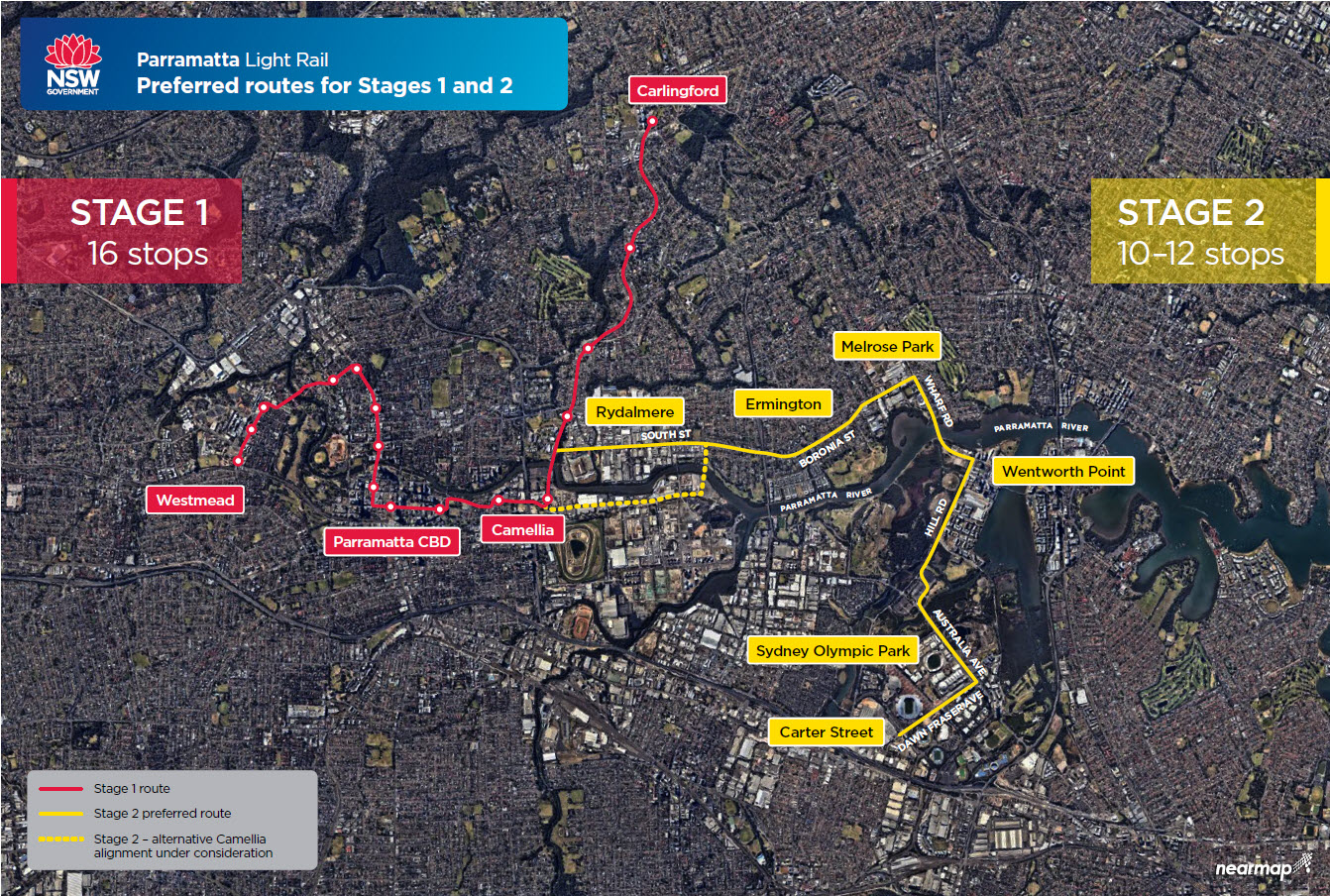The line heads through Rydalmere and Ermington along South and Boronia Streets to Wharf Road at Melrose Park before crossing back over the river on a new bridge to run down Hill Road through Wentworth Point. It then runs through Sydney Olympic park past the SOP railway station on Australia Avenue before tuning into Dawn Fraser to a terminus south of Sydney Olympic Park at Carter Street (see map).