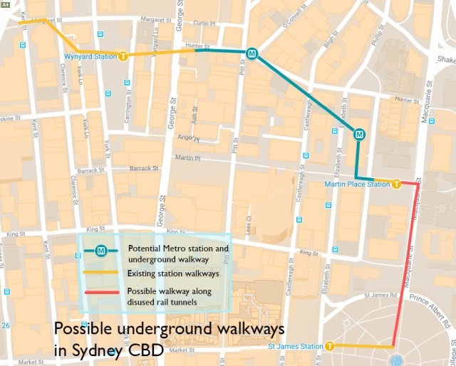 However, the proposed walkway from Wynyard to Martin place would be almost 600 metres in length; if Hunter Street is confirmed as the new location for the Sydney West Metro CBD station it would be around 250 to 300 metres from either station. This would mean that there would be no short-distance interchange between the Sydney West Metro and any other metro or rail line in the CBD.