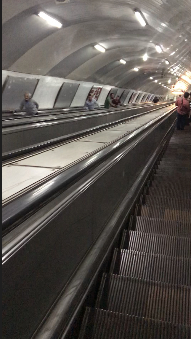 These are the first real surprise. As I said earlier the escalators are exceptionally long which means that the trip down to platform level can take nearly two minutes, almost as long as the trip between adjoining stations. People rarely walk, let alone run; in fact, it’s not unusual for people to sit on the escalator steps.