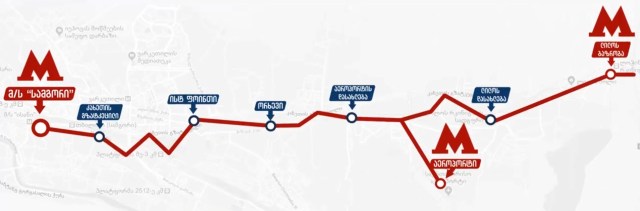 Recently the Georgian government took the latter option. It announced plans for an “above ground” metro to connect from Samgori station on line 1 to the Lilo Market and Tbilisi Airport to the east, with seven stations and the potential to extend to the town of Rustaveli. The line would use part of the existing infrastructure of Tbilisi Bypass Railway, a project which was to build a line around the city, but which was subsequently abandoned. The only map I’ve been able to obtain is a screenshot from a video in Georgian: