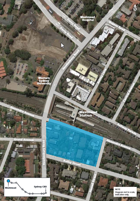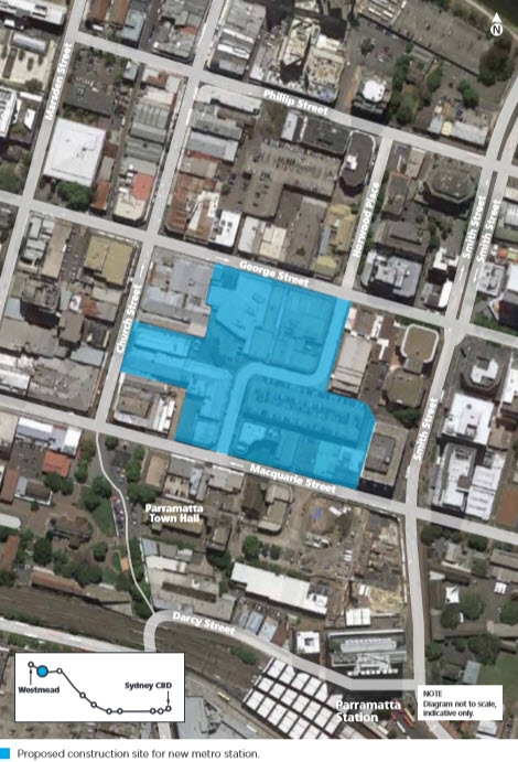 Parramatta: The station will be in the block bounded by George, Macquarie, Church and Smith streets with an entrance on Horwood Place and a second entrance to be determined. This is next to the light rail line but further away from the existing station. However, this location puts the metro in the heart of the rapidly growing Parramatta CBD, meaning it is likely to draw significant traffic away from the existing railway line.