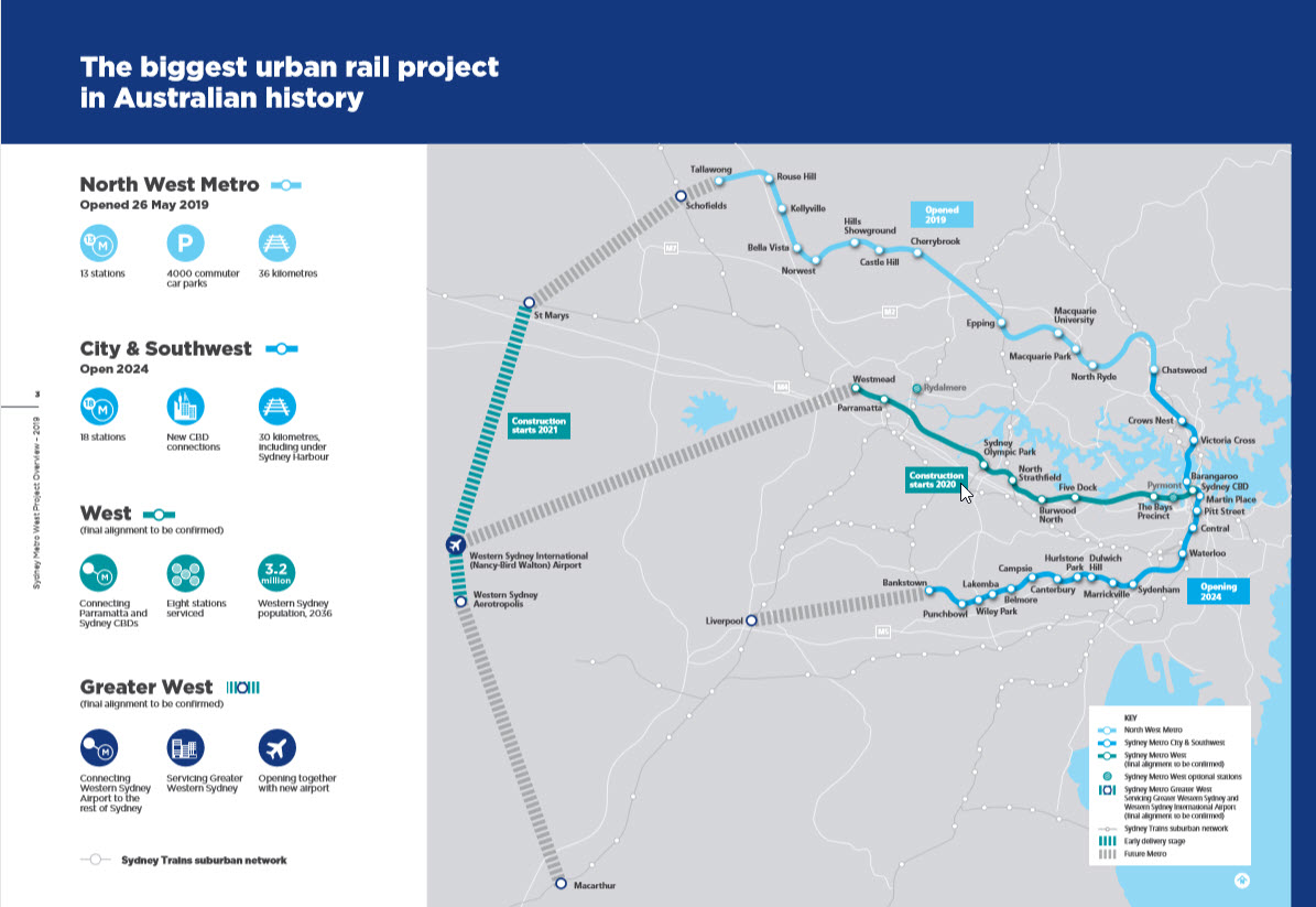 Part of the Overview is a map showing Sydney’s metros in operation, under construction, “in early delivery stage” and planned. This indicates the Sydney Metro West’s potential to be extended to the southwest from Westmead to connect to the Western Sydney International Airport currently under construction (though not before Sydney Metro Greater West is opened to connect the airport to St Marys).